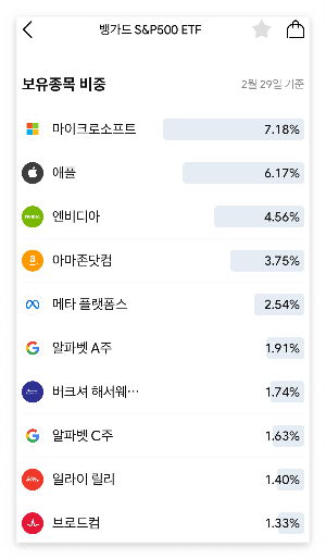 예시로 '뱅가드'사에서 나온 S&P500 ETF를 보면, 이 ETF에 포함된 비중이 큰 기업부터 나열하자면 위와 같습니다. 우리가 아는 유명한 대형기업들이 많죠?